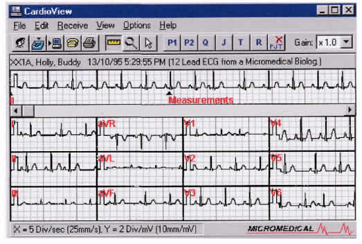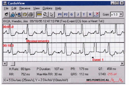 You can modify the length of the ECG shown in the main window: change between 10 sec, 30 sec, 60 sec , 2 Min., 6 Min. or 30 minute scales. You can also change the vertical scale: x 0.5, x l .0 or x 2.0. You can view a 12-lead ECG as an individual strip.